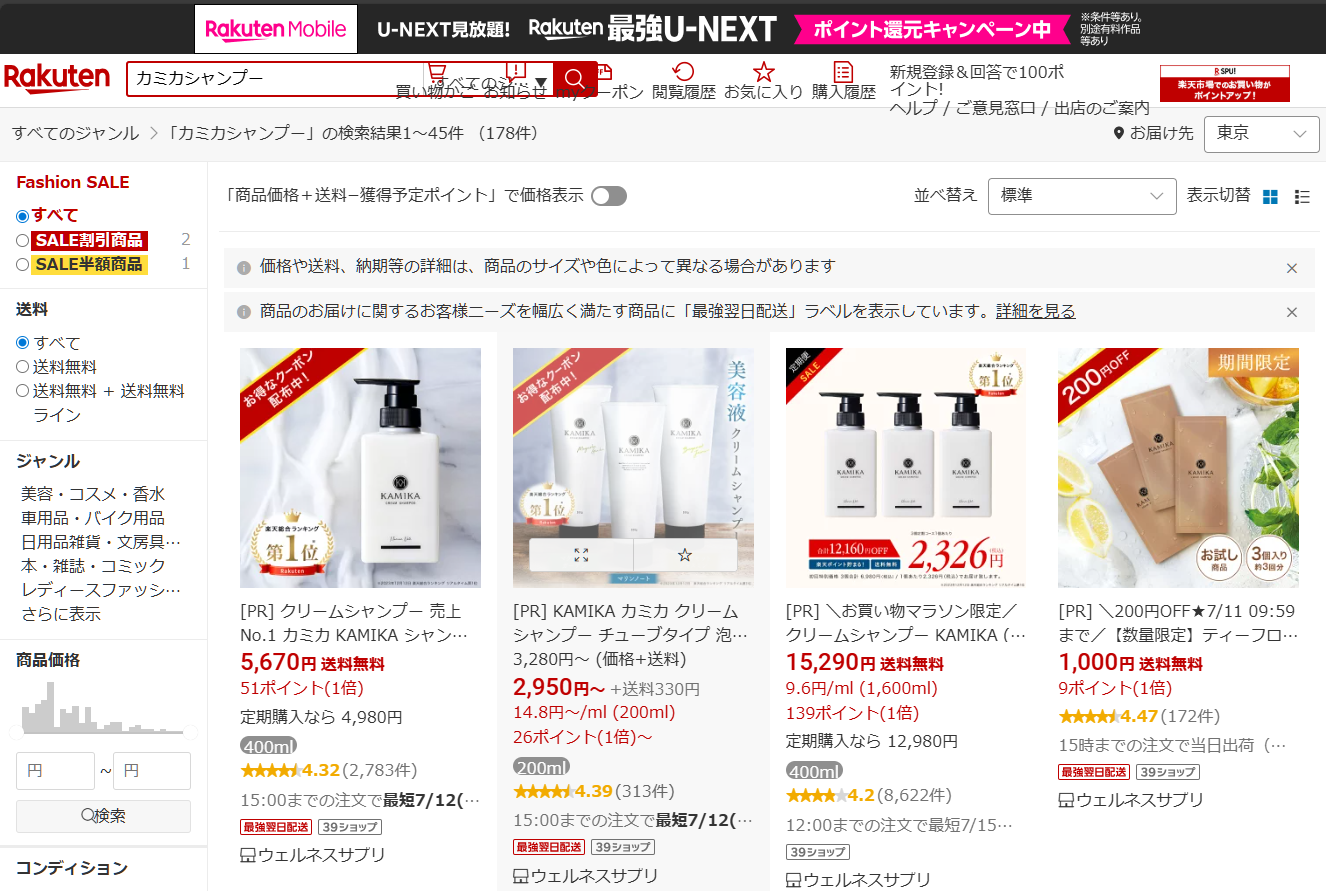 Amazonや楽天の大手通販サイトはポイントも貯まって便利ですが、カミカシャンプーを試すには少し割高になってしまうのがデメリットです。